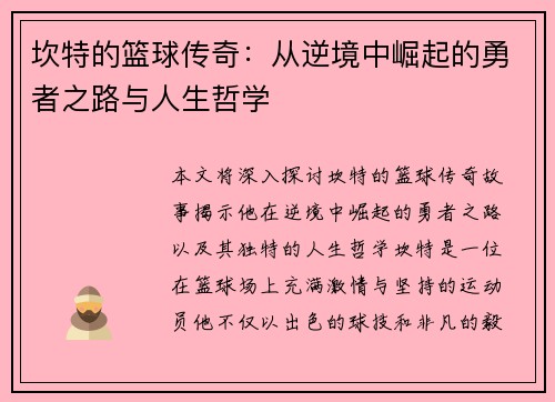 坎特的篮球传奇:从逆境中崛起的勇者之路与人生哲学