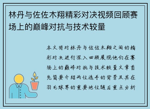 林丹与佐佐木翔精彩对决视频回顾赛场上的巅峰对抗与技术较量